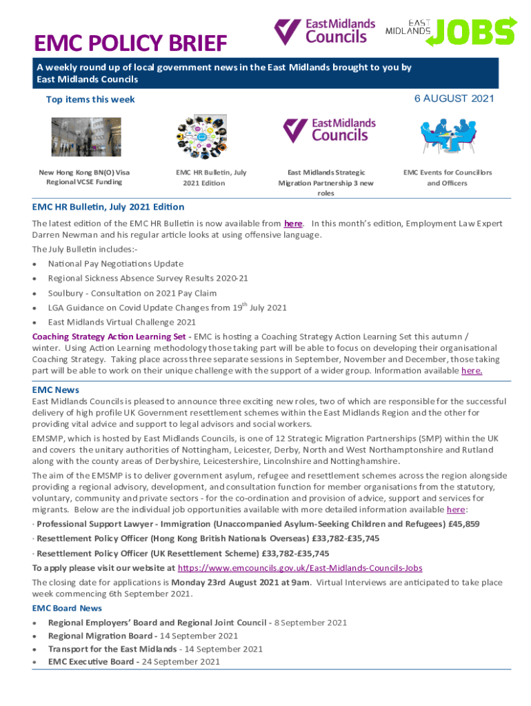 EMC POLICY BRIEF A weekly round up of local government news in the East Midlands brought to you by East Midlands Councils 6 AUGUST 2021Top items this weened Hong Kong IN(O) Visa Regional VASE Funding