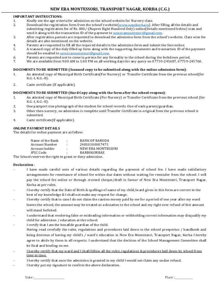 NEW ERA MONTESSORI, TRANSPORT NAGAR, KOREA (C.G.) IMPORTANT INSTRUCTIONS: 1. Kindly see the age criteria for admission on the school website for Nursery class. 2. Download the registration form from