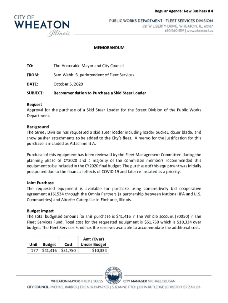 Regular Agenda: New Business # 4MEMORANDUMTO:The Honorable Mayor and City Councilor:Sam Webb, Superintendent of Fleet ServicesDATE:October 5, 2020SUBJECT:Recommendation to Purchase a Skid Steer LoaderRequest