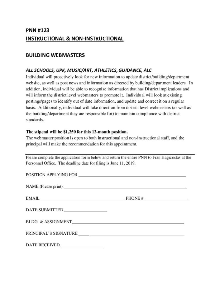 PNN #123 INSTRUCTIONAL & INSTRUCTIONAL BUILDING WEBMASTERS ALL SCHOOLS, UPK, MUSIC/ART, ATHLETICS, GUIDANCE, ALC Individual will proactively look for new information to update district/building/department