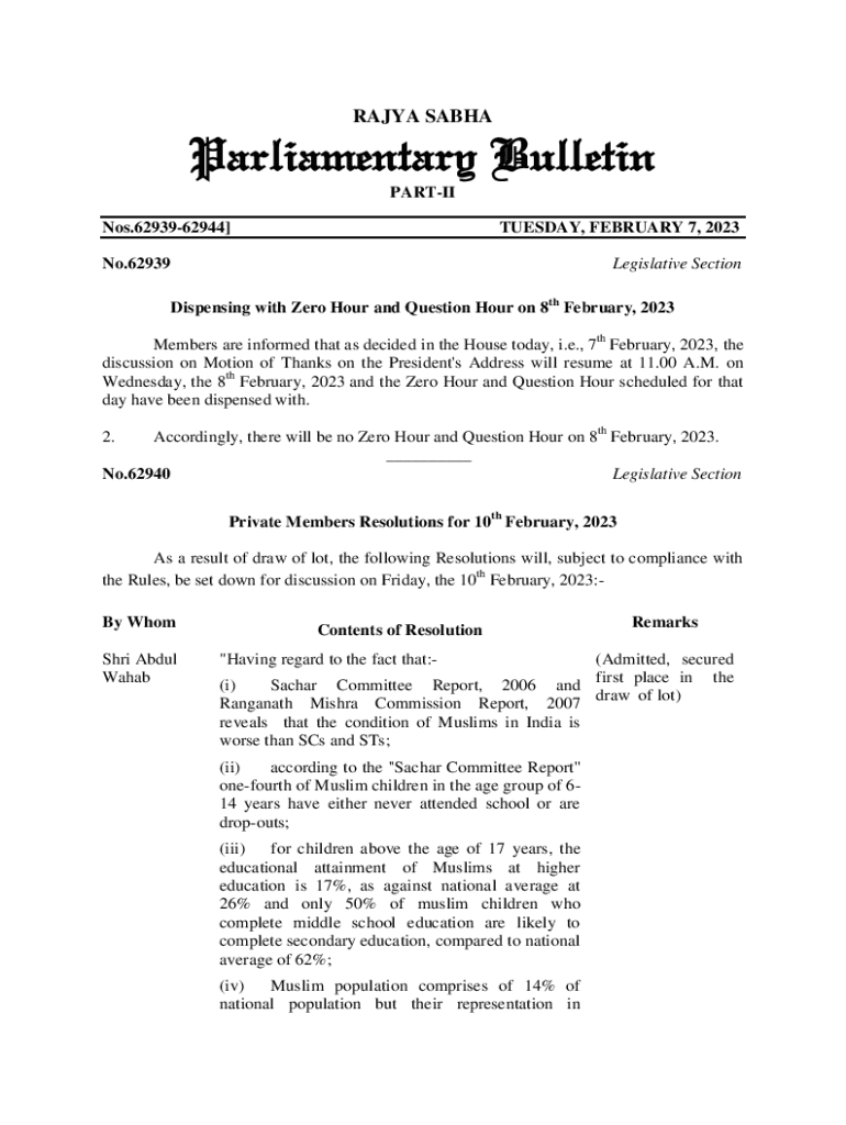 RAJA SABHAParliamentary Bulletin PART Nos.6293962944]TUESDAY, FEBRUARY 7, 2023, Legislative Section No.62939Dispensing with Zero Hour and Question Hour on 8th February 2023 Members are informed that