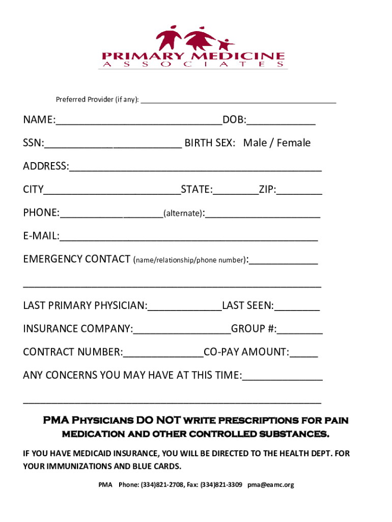 Preferred Provider (if any): ___NAME:___DOB:___ SSN:___ BIRTH SEX: Male / Female ADDRESS:___ CITY___STATE:___ZIP:___ PHONE:___(alternate):___ EMAIL:___ EMERGENCY CONTACT (name/relationship/phone number):___