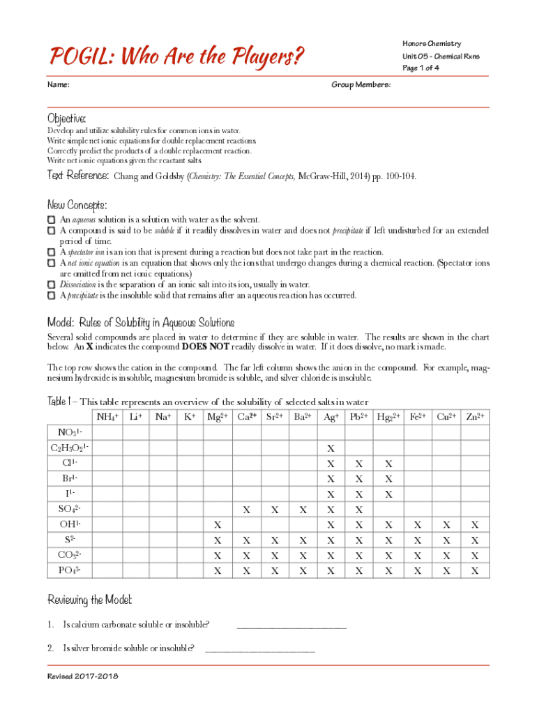 PO GIL: Who Are the Players? Name:Honors Chemistry Unit 05 Chemical Runs Page 1 of 4Group Members:! Objective: Develop and utilize solubility rules for common ions in water. Write simple net ionic