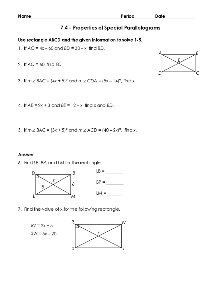 Name___ Period___ Date___7.4 Properties of Special Parallelograms Use rectangle BCD and the given information to solve 15. 1. If AC 4x 60 and BD 30 x, find BD. A E2. If AC 60, find EC. D 3. If m BAC