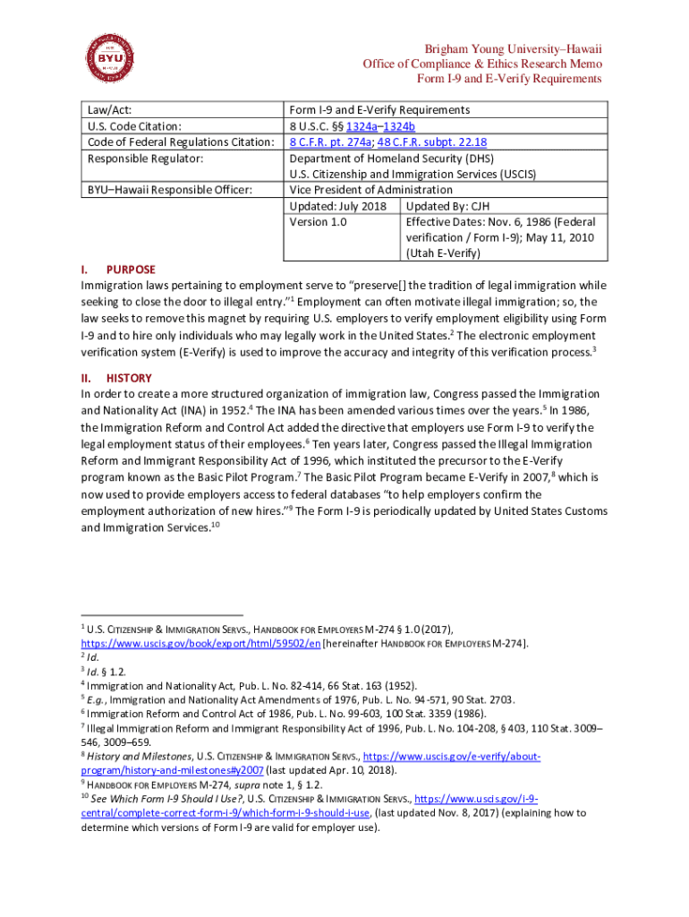 Brigham Young University Hawaii Office of Compliance & Ethics Research Memo Form I9 and Verify Requirements Law/Act: U.S. Code Citation: Code of Federal Regulations Citation: Responsible Regulator: