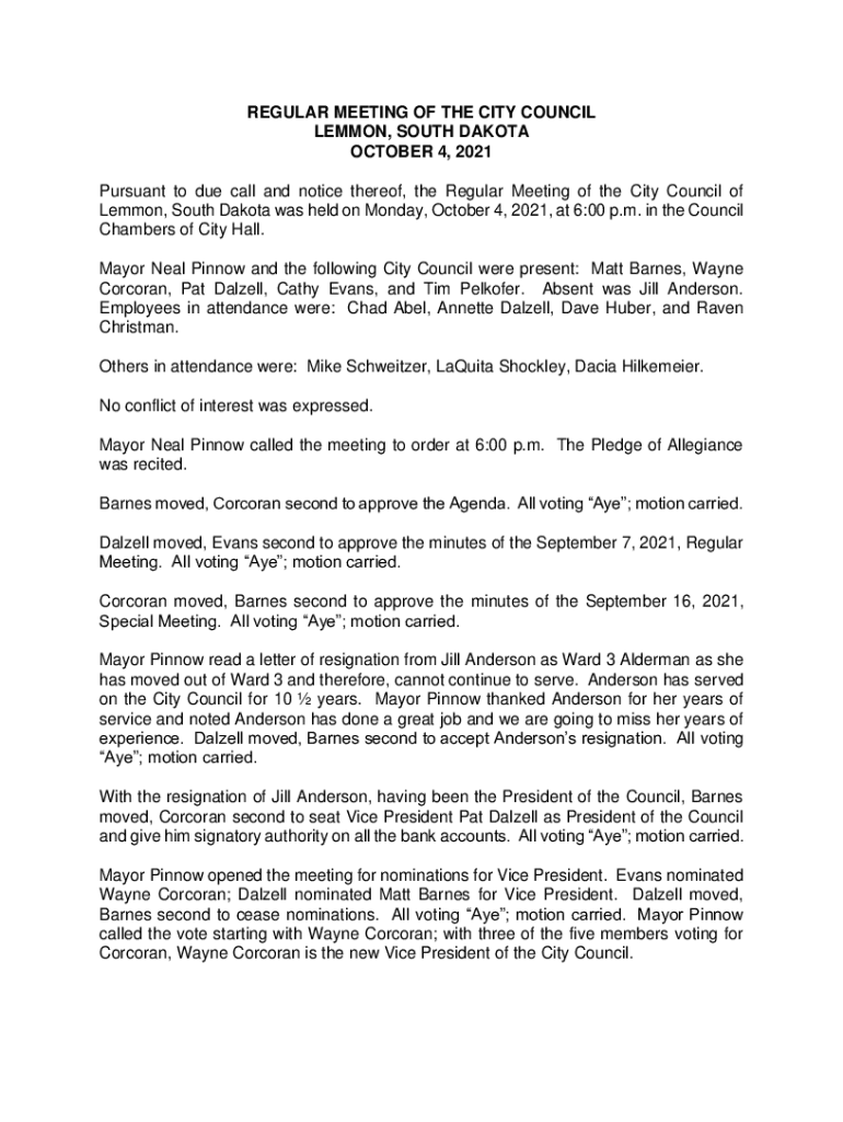 REGULAR MEETING OF THE CITY COUNCIL LEMON, SOUTH DAKOTA OCTOBER 4, 2021, Pursuant to do call and notice thereof, the Regular Meeting of the City Council of Lemon, South Dakota was held on Monday,
