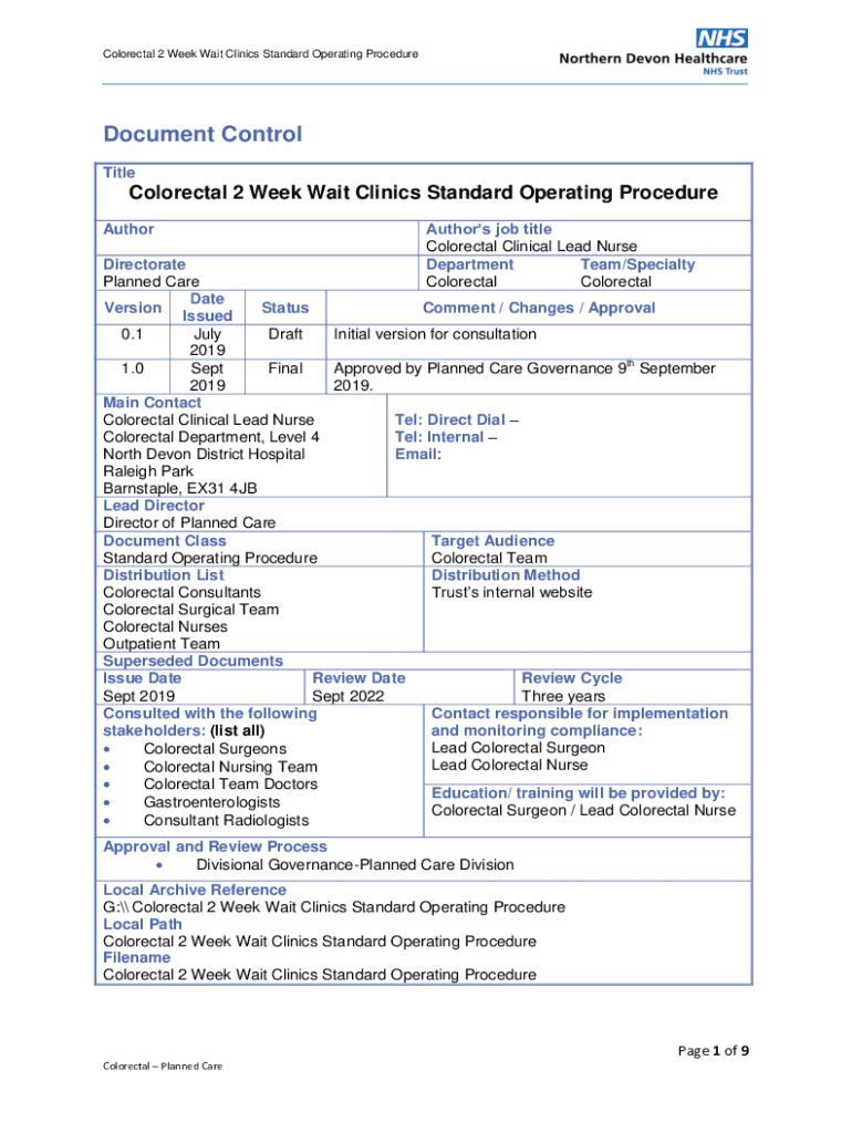 Colorectal 2 Week Wait Clinics Standard Operating ProcedureDocument Control TitleColorectal 2 Week Wait Clinics Standard Operating Procedure AuthorAuthors job title Colorectal Clinical Lead Nurse