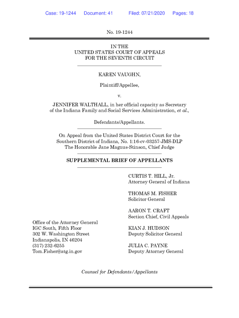 Case: 191244Document: 41Filed: 07/21/2020Pages: 18No. 191244 IN THE UNITED STATES COURT OF APPEALS FOR THE SEVENTH CIRCUIT ___ KAREN VAUGHN, Plaintiff/Appealed, v. JENNIFER WALTHAM, in her official