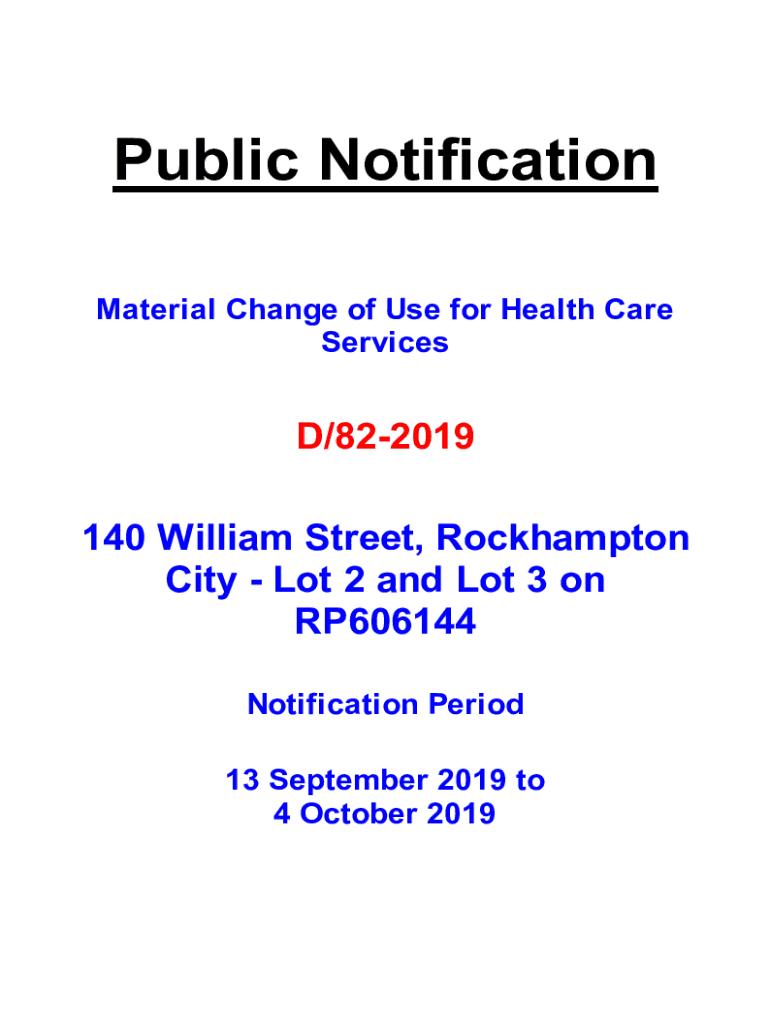 Public Notification Material Change of Use for Health Care Services/822019 140 William Street, Rockhampton City Lot 2 and Lot 3 on RP606144 Notification Period 13 September 2019 to 4 October 201924535
