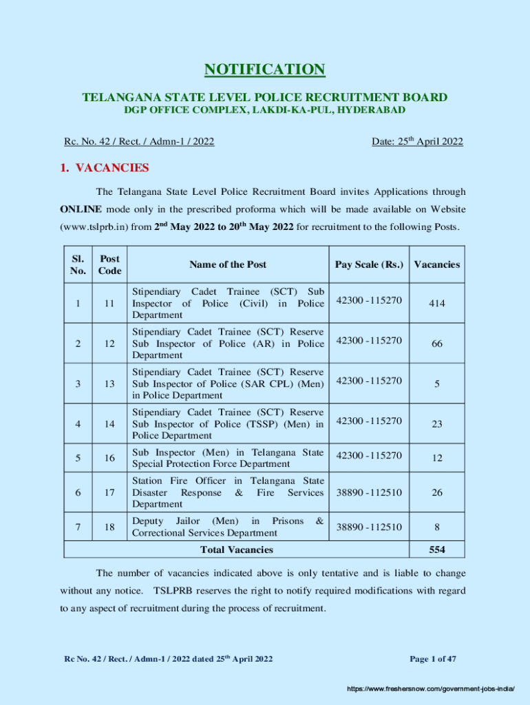 NOTIFICATION TELANGANA STATE LEVEL POLICE RECRUITMENT BOARD DGP OFFICE COMPLEX, LAKDIKAPUL, HYDERABAD Date: 25th April 2022Rc. No. 42 / Rest. / Admn1 / 20221. VACANCIES The Telangana State Level Police