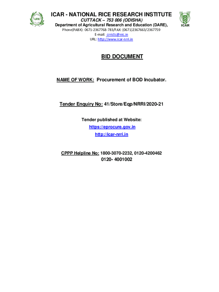 CAR NATIONAL RICE RESEARCH INSTITUTE CUTTACK 753 006 (ODISHA) Department of Agricultural Research and Education (DARE), Phone(PBX): 06712367768783/FAX: (0671)2367663/2367759 Email: crrictc@nic.in