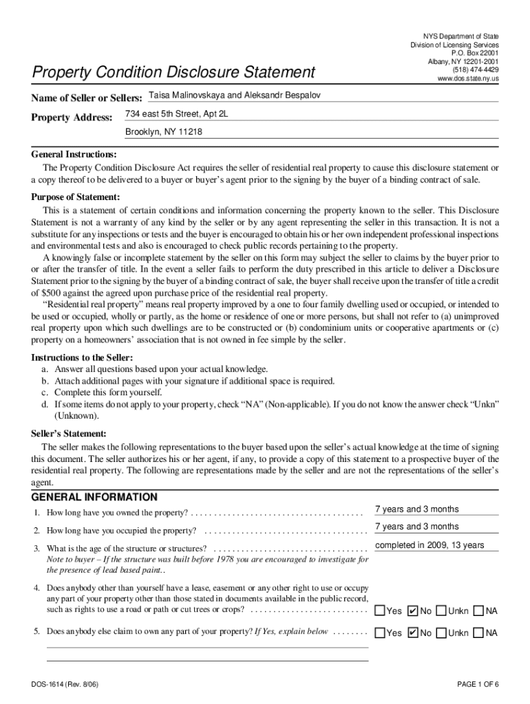 Property Condition Disclosure Statements Department of State Division of Licensing Services P.O. Box 22001 Albany, NY 122012001 (518) 4744429 www.dos.state.ny.usName of Seller or Sellers: Ties Malinovskaya