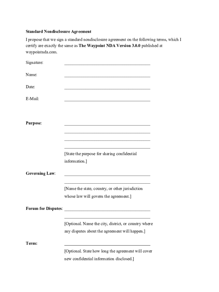 Standard Nondisclosure Agreement I propose that we sign a standard nondisclosure agreement on the following terms, which I certify are exactly the same as The Waypoint NDA Version 3.0.0 published
