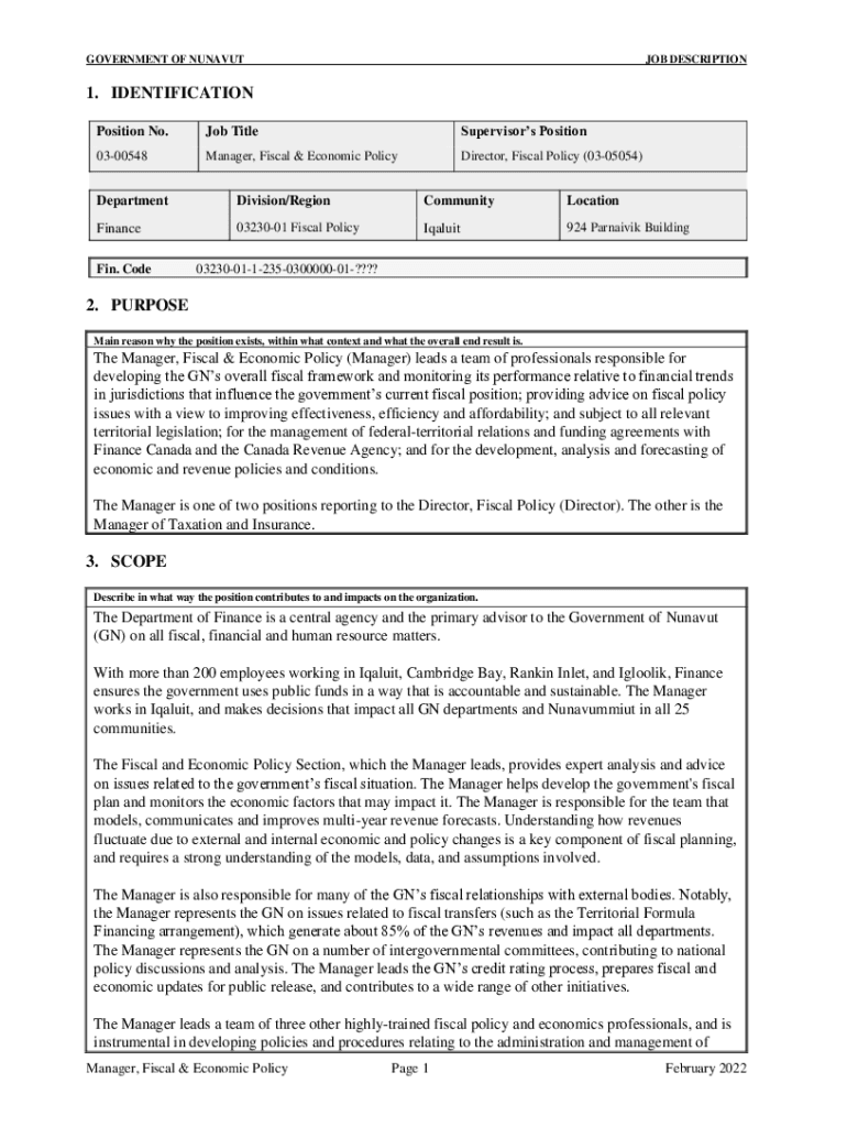 Position No. Job TitleSupervisors Position0300548Manager, Fiscal & Economic PolicyDirector, Fiscal Policy (0305054)DepartmentDivision/RegionCommunityLocationFinance0323001