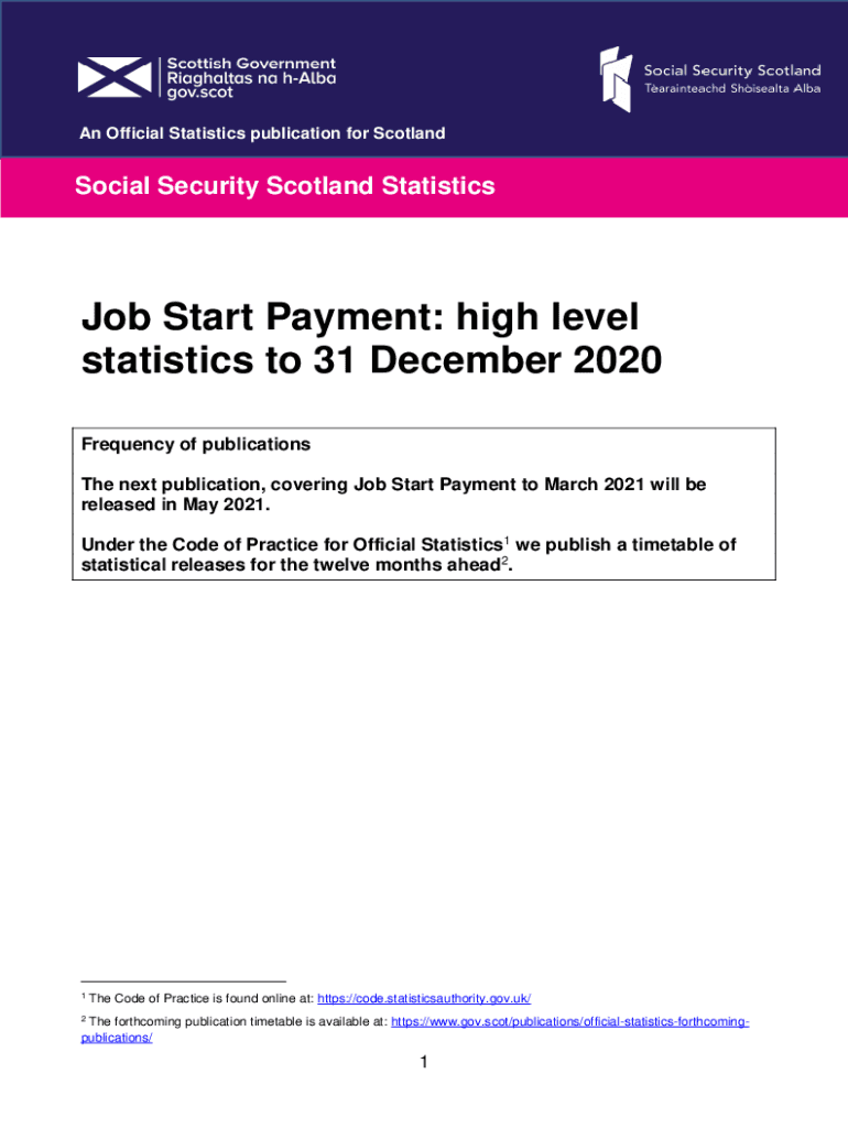 An Official Statistics publication for ScotlandSocial Security Scotland Statistics Job Start Payment: high level statistics to 31 December 2020 Frequency of publications The next publication, covering