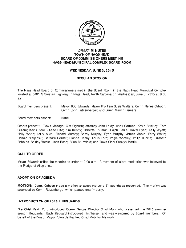 DR AFT MINUTES TOWN OF NAGS Headboard OF COMMISSIONERS MEETING NAGS HEAD MUNICIPAL COMPLEX Boardroom WEDNESDAY, JUNE 3, 2015, REGULAR SESSION The Nags Headboard of Commissioners met in the Board Room