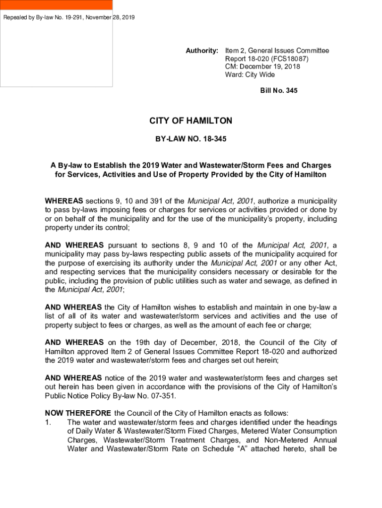 Authority: Item 2, General Issues Committee Report 18020 (FCS18087) CM: December 19, 2018, Ward: City Wide Bill No. 345CITY OF HAMILTON BYLAW NO. 18345 A Bylaw to Establish the 2019 Water and Wastewater/Storm