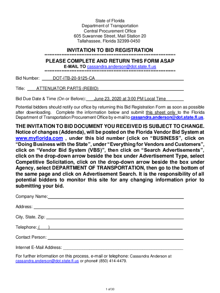 State of Florida Department of Transportation Central Procurement Office 605 Suwanee Street, Mail Station 20 Tallahassee, Florida 323990450INVITATION TO BID REGISTRATION ******************************************************************************PLEASE