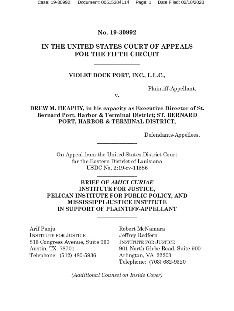 Case: 1930992Document: 00515304114Page: 1Date Filed: 02/10/2020No. 1930992 IN THE UNITED STATES COURT OF APPEALS FOR THE FIFTH CIRCUIT ___ VIOLET DOCK PORT, INC., L.L.C., v. PlaintiffAppellant, DREW
