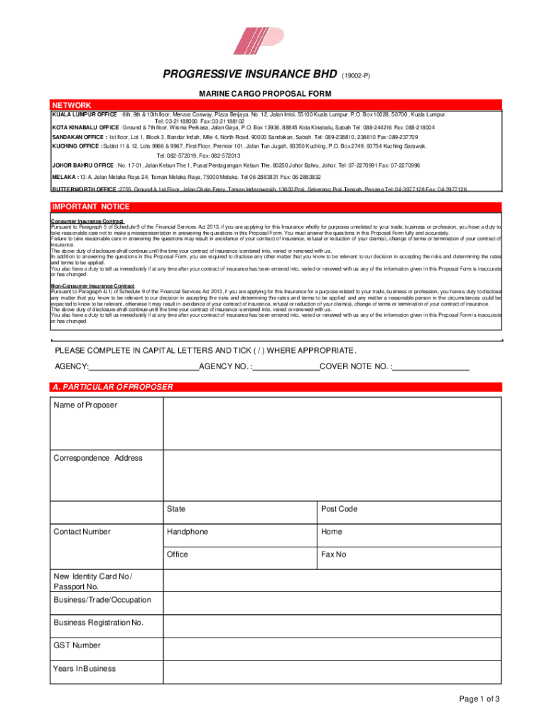 Get the free Marine Cargo Proposal Form - Progressive Insurance Bhd