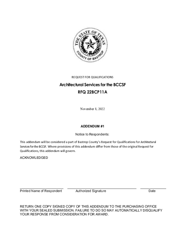 REQUEST FOR QUALIFICATIONSArchitectural Services for the BC CSF RFQ 22BCP11ANovember 8, 2022ADDENDUM #1 Notice to Respondents: This addendum will be considered a part of Bastrop Counties Request for