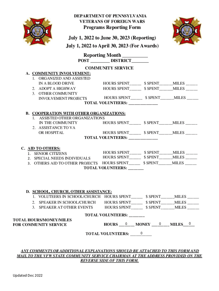 DEPARTMENT OF PENNSYLVANIA VETERANS OF FOREIGN Reprograms Reporting Form July 1, 2022, to June 30, 2023 (Reporting) July 1, 2022, to April 30, 2023 (For Awards) Reporting Month ___ POST ___ DISTRICT___