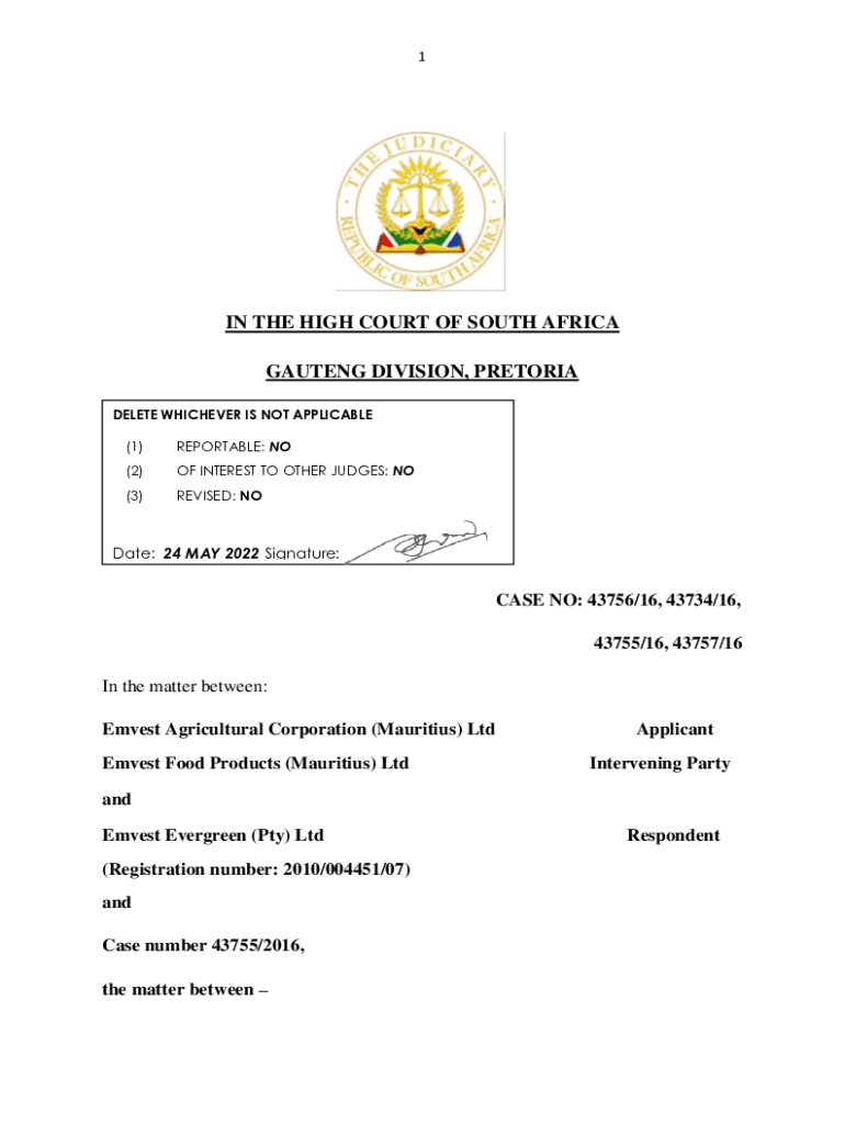 1IN THE HIGH COURT OF SOUTH AFRICA GLUTEN DIVISION, PRETORIA DELETE WHICHEVER IS NOT APPLICABLE (1)REPORTABLE: NO(2)OF INTEREST TO OTHER JUDGES: NO(3)REVISED: Notate: 24 MAY 2022 Signature: ___CASE