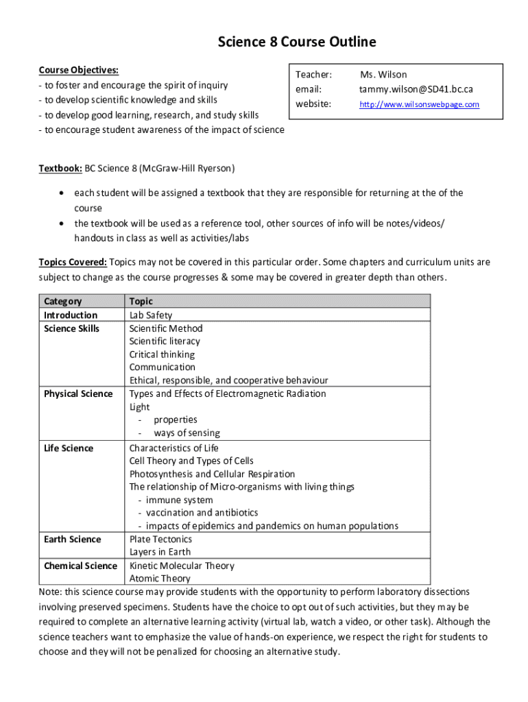 Science 8 Course Outline Course Objectives: to foster and encourage the spirit of inquiry to develop scientific knowledge and skills to develop good learning, research, and study skills to encourage
