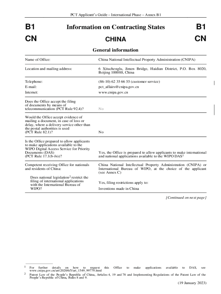PCT Applicants Guide International Phase Annex B1B1Information on Contracting StatesB1CNCHINACNGeneral information Name of Office:China National Intellectual Property Administration (CN IPA)Location
