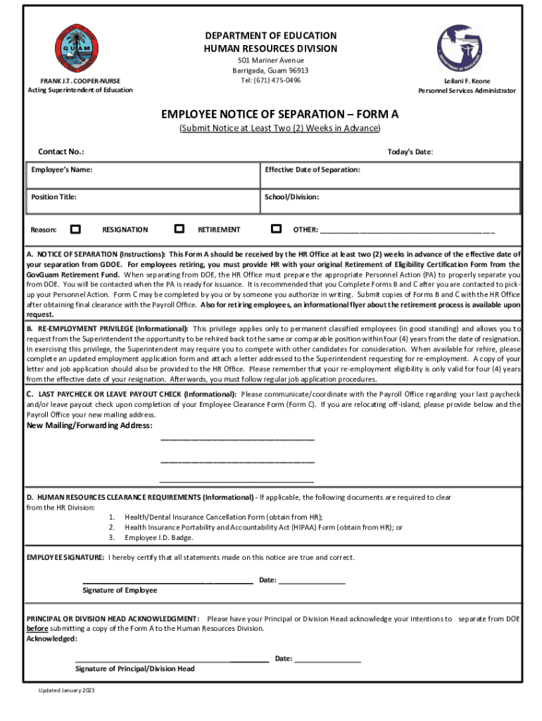 Get the free EMPLOYEE NOTICE OF SEPARATION FORM A
