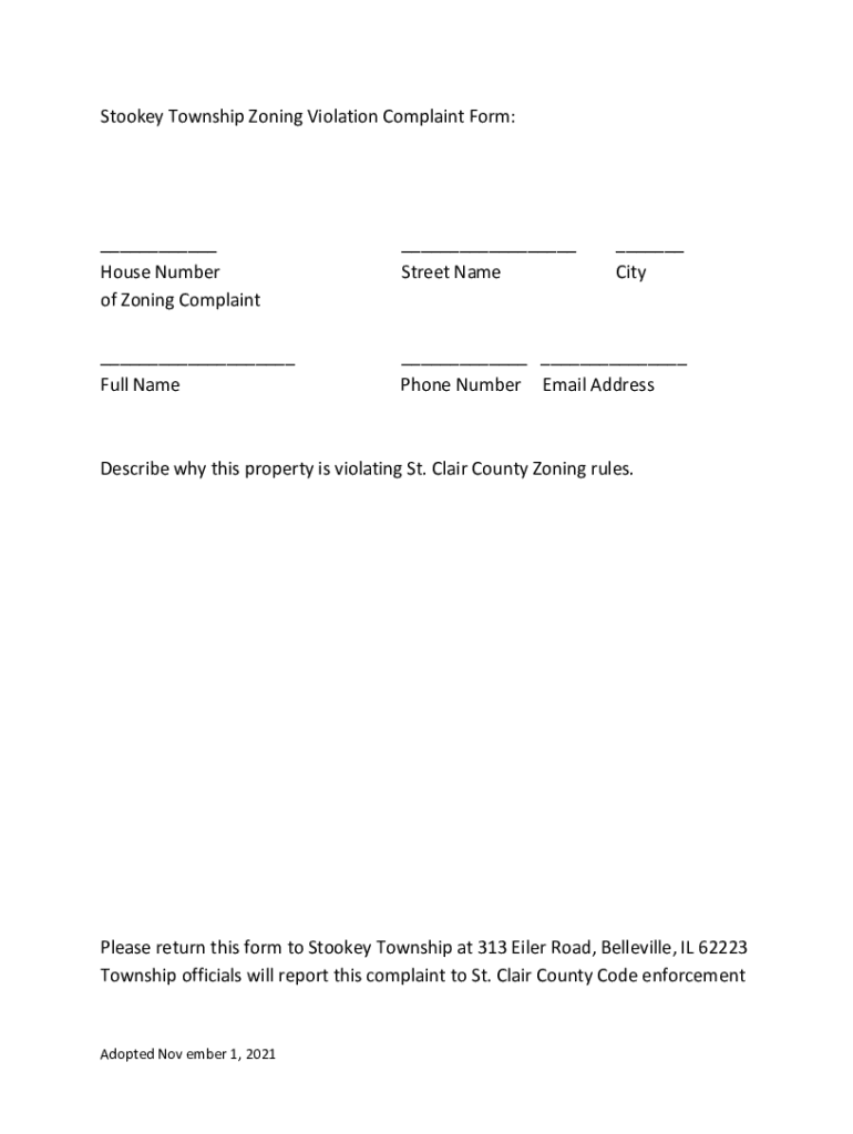 Stroke Township Zoning Violation Complaint Form:___ House Number of Zoning Complaint___ Street Name___ City___ Full Name___ ___ Phone Number Email AddressDescribe why this property is violating St.
