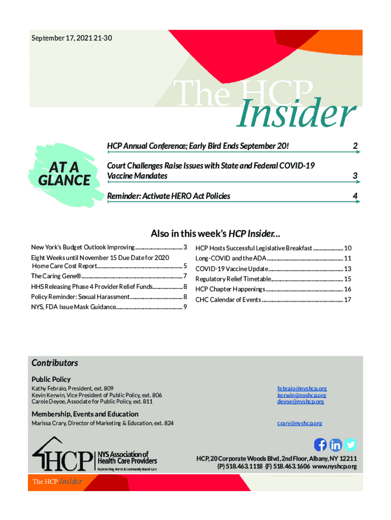 September 17, 2021 2130HCP Annual Conference; Early Bird Ends September 20!AT A GLANCE2Court Challenges Raise Issues with State and Federal COVID-19 Vaccine Mandates3 Reminder: Activate HERO Act Policies4Also