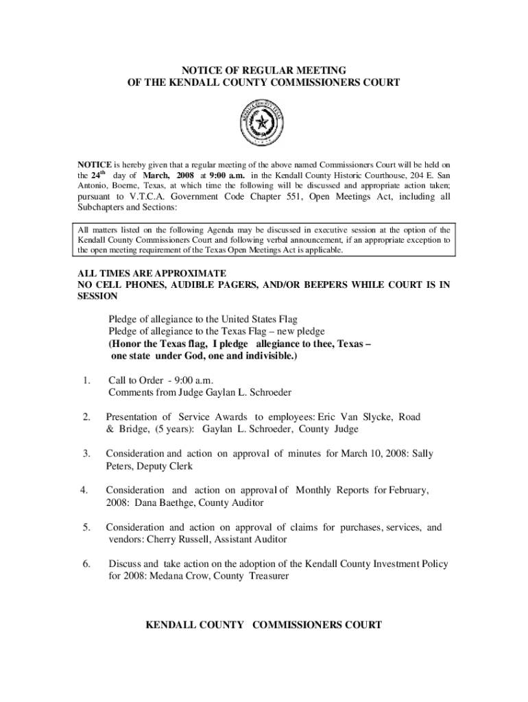 NOTICE OF REGULAR MEETING OF THE KENDALL COUNTY COMMISSIONERS COURTNOTICE is hereby given that a regular meeting of the above named Commissioners Court will be held on the 24th day of March 2008 at