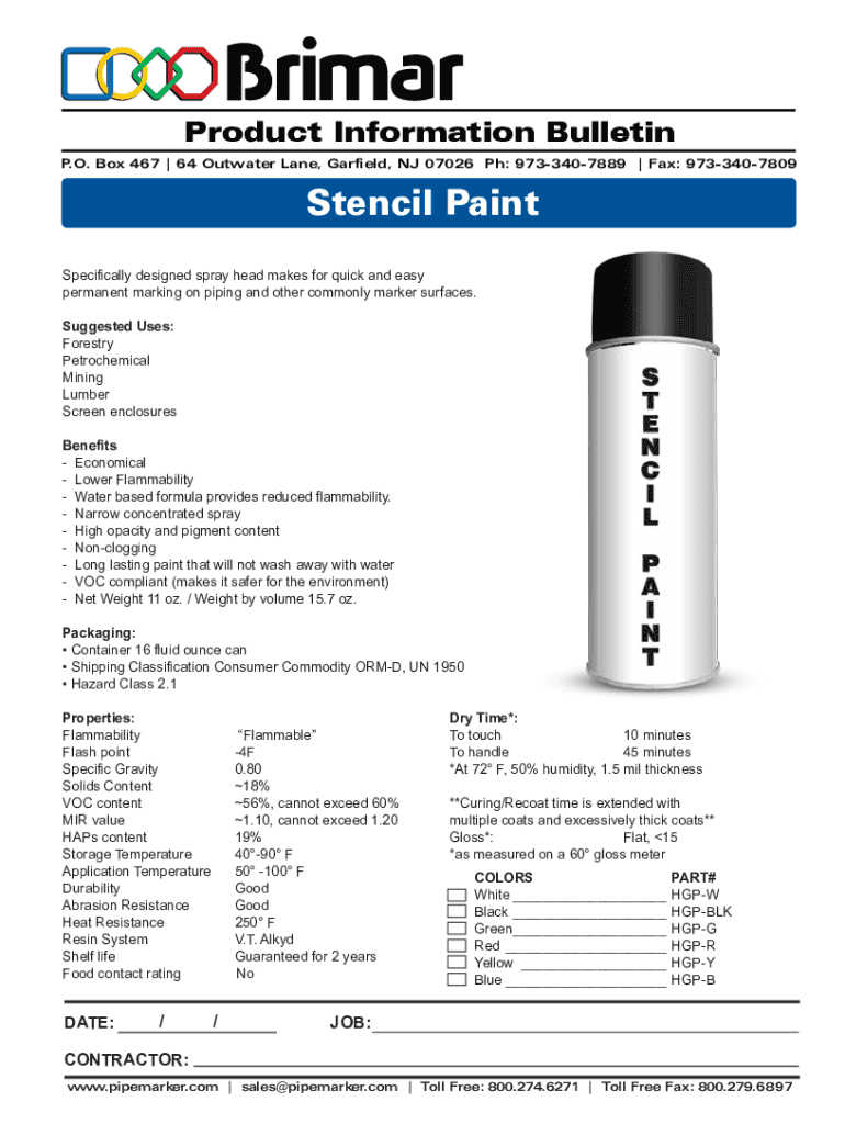 Product Information Bulletin P.O. Box 467 | 64 Out water Lane, Garfield, NJ 07026 pH: 9733407889 | Fax: 9733407809Stencil Paint Specifically designed spray head makes for quick and easy permanent