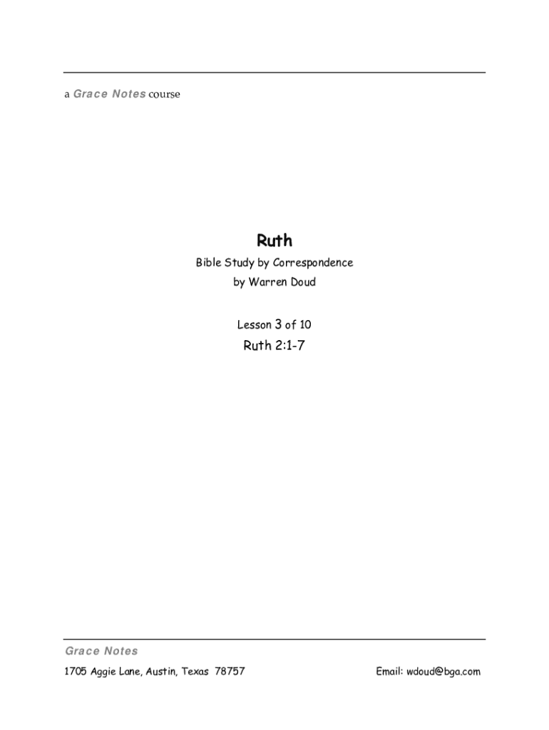 A Grace Notes course Ruth Bible Study by Correspondence by Warren Loud Lesson 3 of 10Ruth 2:17Grace Notes 1705 Aggie Lane, Austin, Texas 78757Email: wdoud@bga.comRuth Lesson 3: Ruth 2:17 Instruction