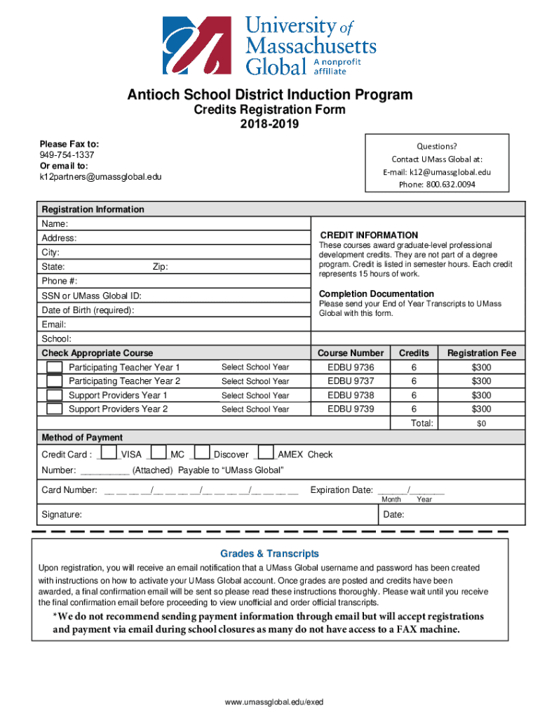 Antioch School District Induction Program Credits Registration Form 20182019 Please Fax to: 9497541337 Or email to: k12partners@umassglobal.eduQuestions? Contactless Global at: Email:k12@umassglobal.edu