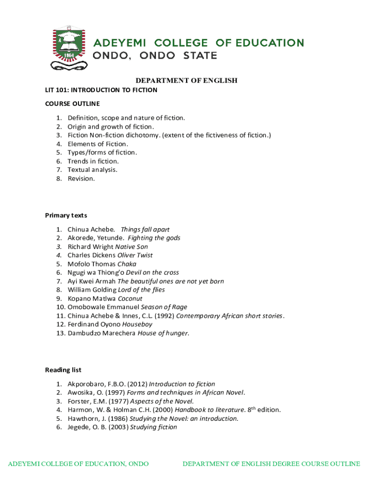 DEPARTMENT OF ENGLISH LIT 101: INTRODUCTION TO FICTION COURSE OUTLINE 1. 2. 3. 4. 5. 6. 7. 8. Definition, scope and nature of fiction. Origin and growth of fiction. Fiction Nonfiction dichotomy. (extent