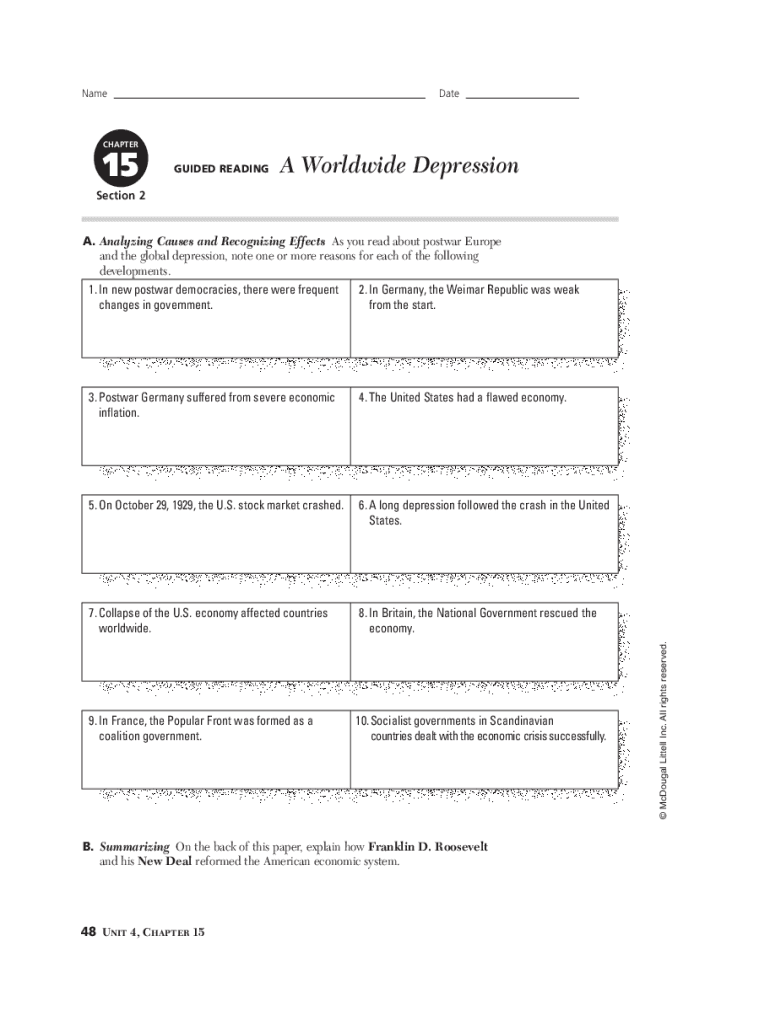 Mwh10aIDRO415_P212/15/20031:16 PM Page 48NameDateCHAPTER15GUIDED READING Worldwide DepressionSection 21. In new postwar democracies, there were frequent changes in government.2. In Germany, the Weimar