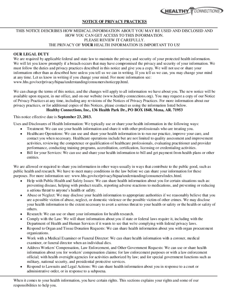 Notice of privacy practices can be filled out by providing information about how the organization uses and protects patients' health information, including details about data sharing and privacy policies.