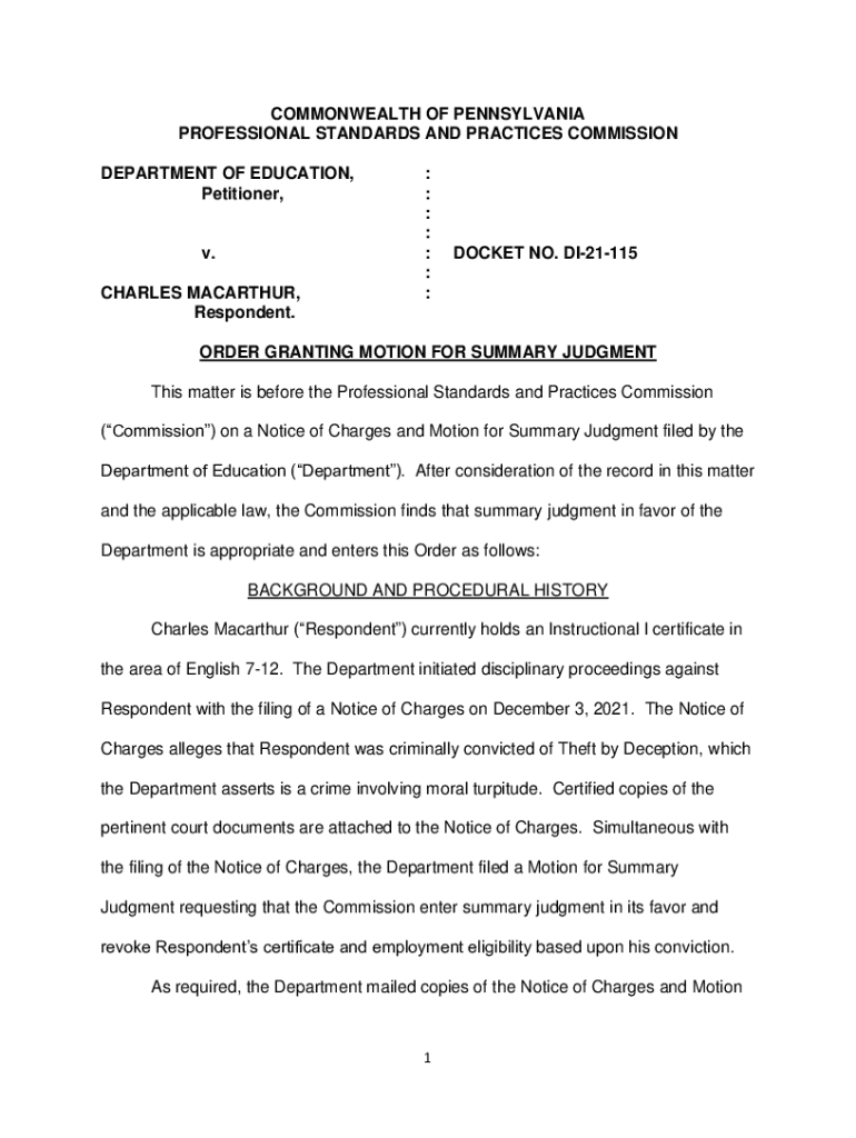 COMMONWEALTH OF PENNSYLVANIA PROFESSIONAL STANDARDS AND PRACTICES COMMISSION DEPARTMENT OF EDUCATION, Petitioner, v. CHARLES MacArthur, Respondent.: : : : : : :DOCKET NO. DI21115ORDER GRANTING MOTION