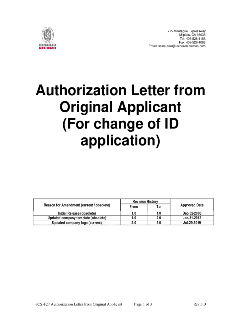 775 Montague Expressway Milpitas, CA 95035 Tel: 4085261188 Fax: 4085261088 Email: sales.eaw@us.bureauveritas.comAuthorization Letter from Original Applicant (For change of ID application)Reason for