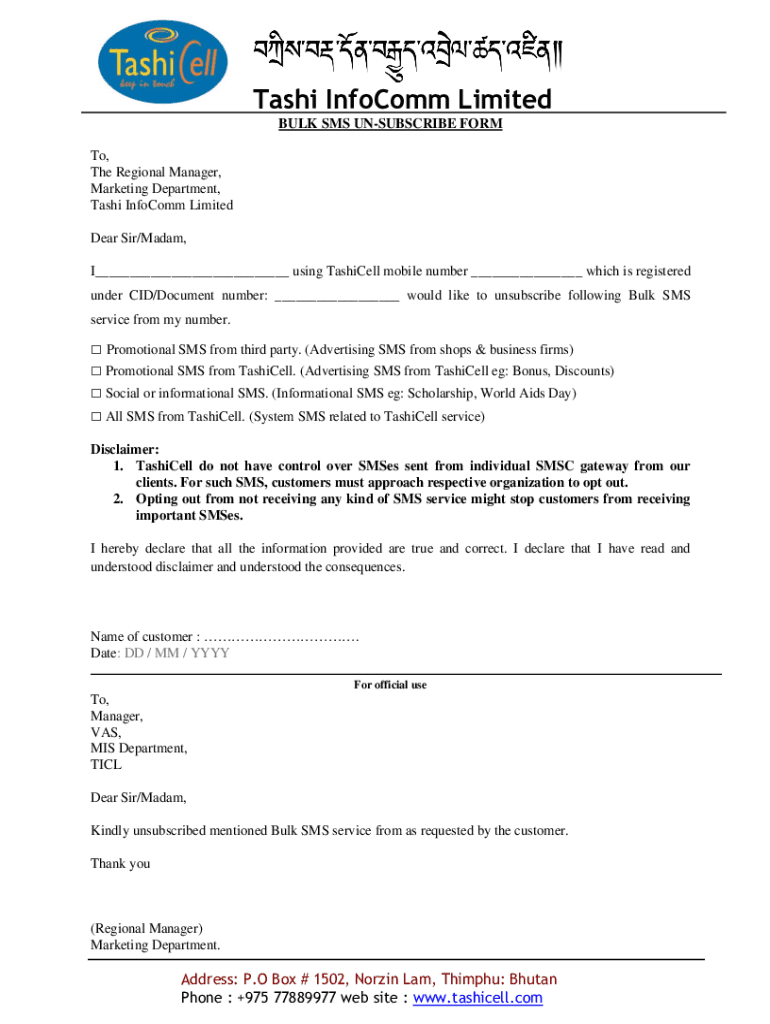 Get the free Bulk SMS Un-subscribe Form - Tashi InfoComm Limited