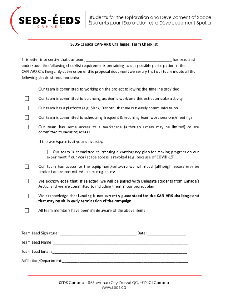 students pour l\'Exploration et LE Development SpatialSEDSCanada CANARD Challenge: Team Checklist