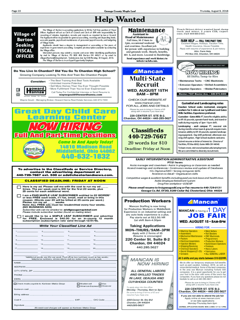 Gauge County Maple Leafage 22Thursday, August 9, 2018Help Wanted Village of Burton Seeking FISCAL Officer Village of Burton is accepting applications to fill the Full Time position of Fiscal Officer.