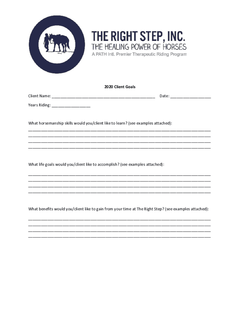 2020 Client Goals Client Name: ___Date: ___Years Riding: ___What horsemanship skills would you/client like to learn? (see examples attached): ___ ___ ___ ___What life goals would you/client like to