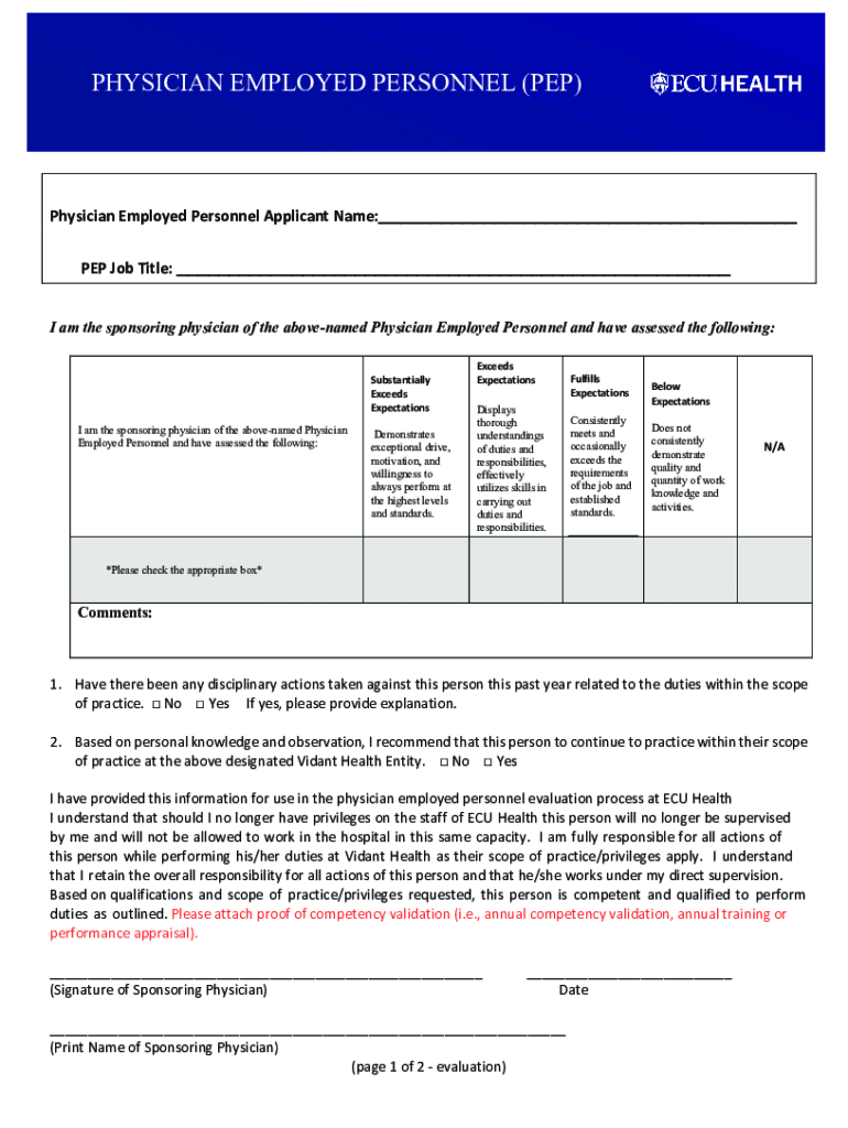 PHYSICIAN EMPLOYED PERSONNEL (PEP) SPONSORING PHYSICIAN EVALUATION FORM for Physician Employed Personnel (PEP)Physician Employed Personnel Applicant Name:___ PEP Job Title: ___ I am the sponsoring