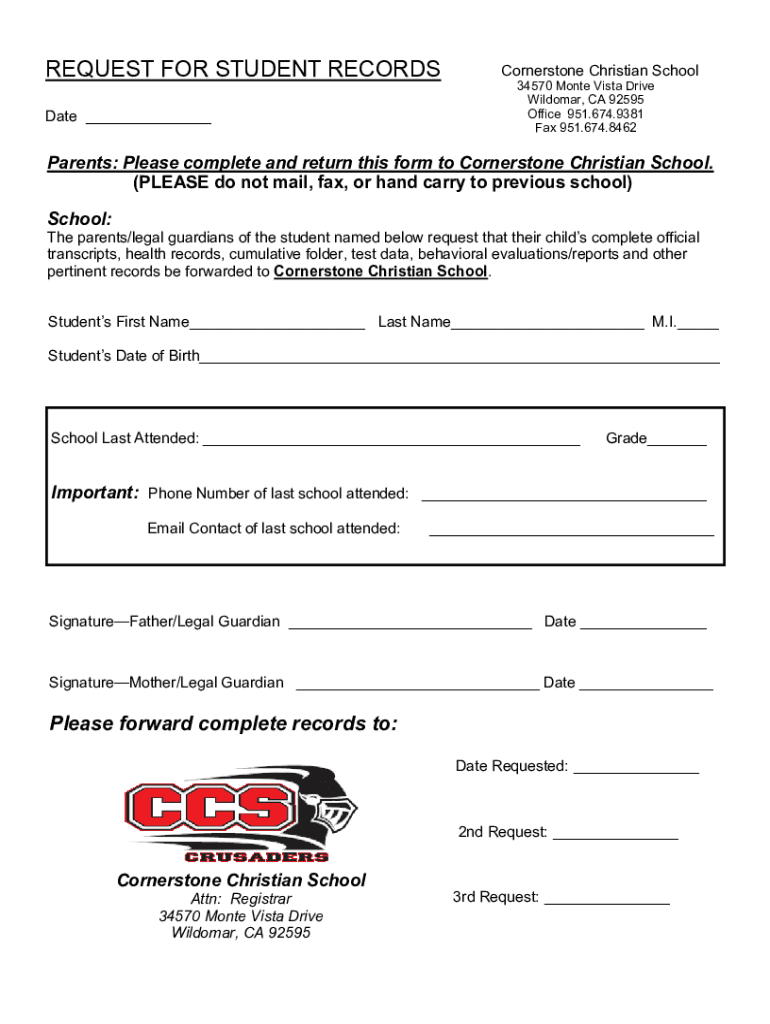 Get the free Request for Student Records - Cornerstone Christian School