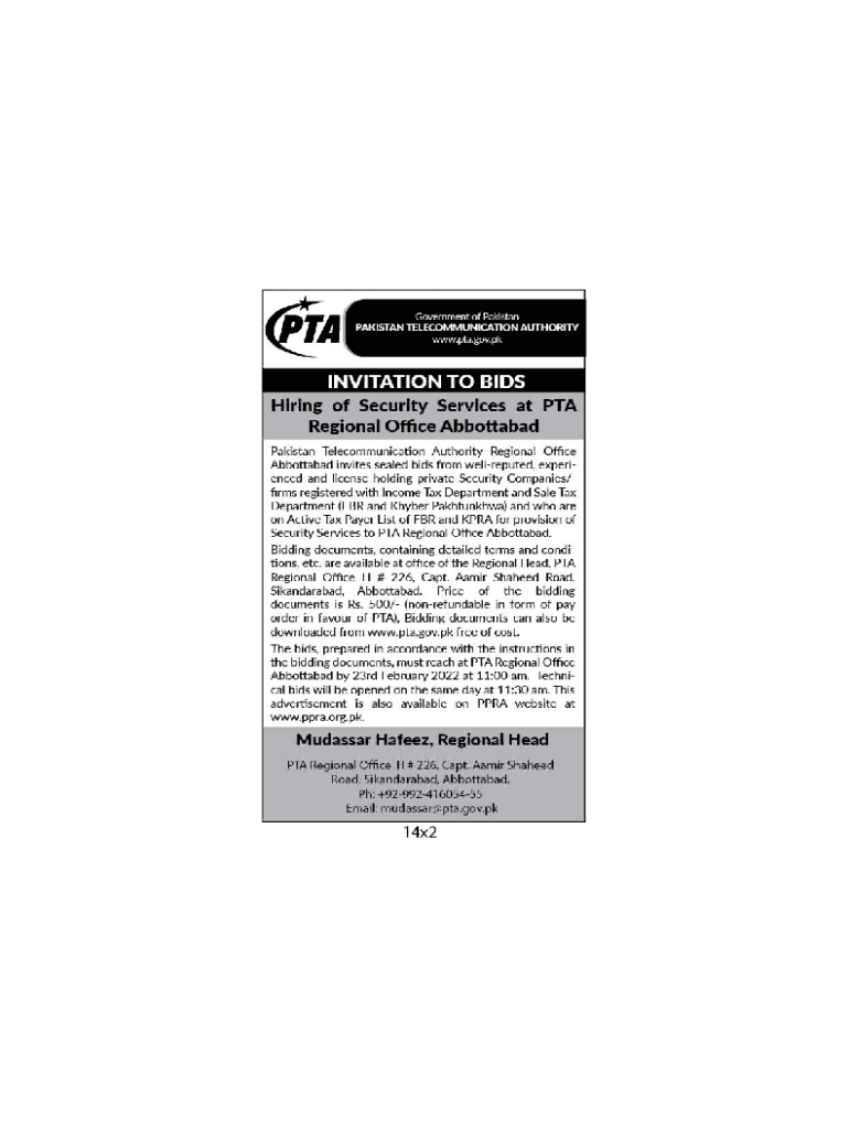Government of Pakistan Telecommunication Authority Regional Office, H#226, Capt. Amir Shaheed Rd, Abbottabad www.pta.gov.pk, Tel: 09924160545 BIDDING DOCUMENT For Provision of Security Services at