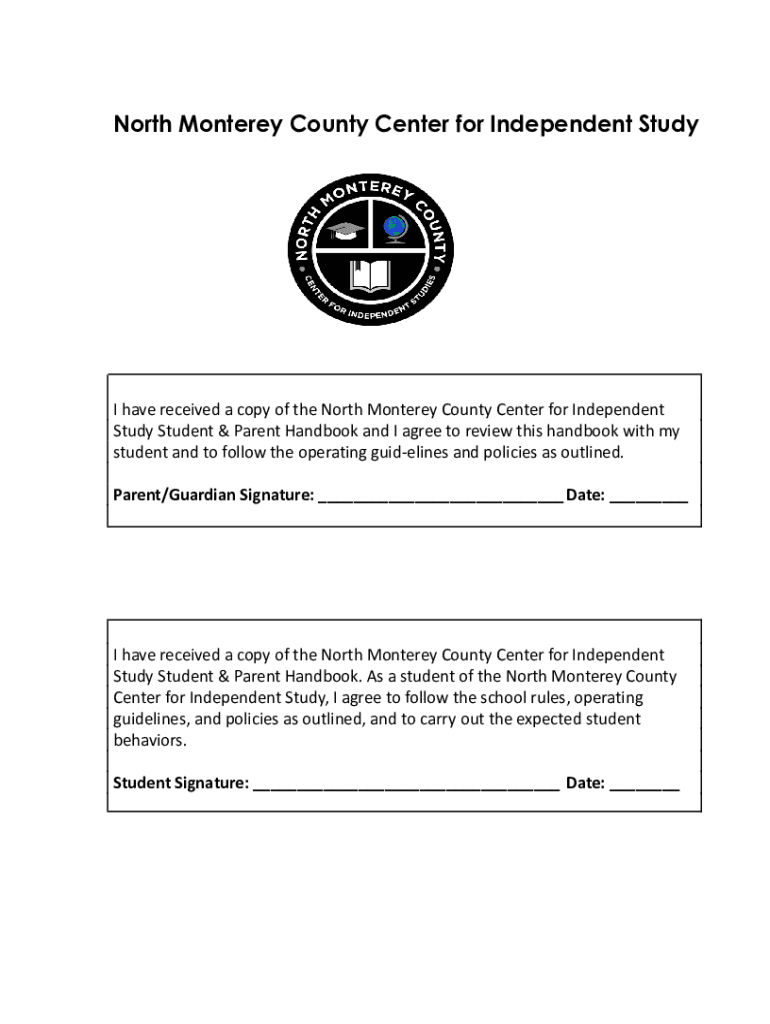 North Monterey County Center for Independent Study have received a copy of the North Monterey County Center for Independent Study Student & Parent Handbook and I agree to review this handbook with