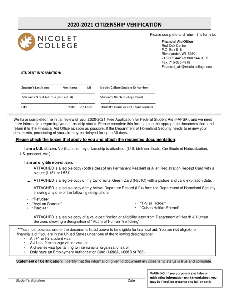 20202021 CITIZENSHIP VERIFICATION Please complete and return this form to: Financial Aid Office Red Oak Center P.O. Box 518 Rhinelander, WI 54501 7153654423 or 8005443039 Fax: 7153654918 Financial_aid@nicoletcollege.eduSTUDENT